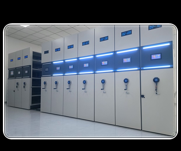 智能型檔案館密集柜是通過改造復柱式雙面固定柜,在其底座安裝軸輪,從而使之沿地面鋪設的小導軌直線移動,還可將多個柜子靠攏或分開,根據具體需要進行組裝組合,是一種可移動的密集型檔案裝具。