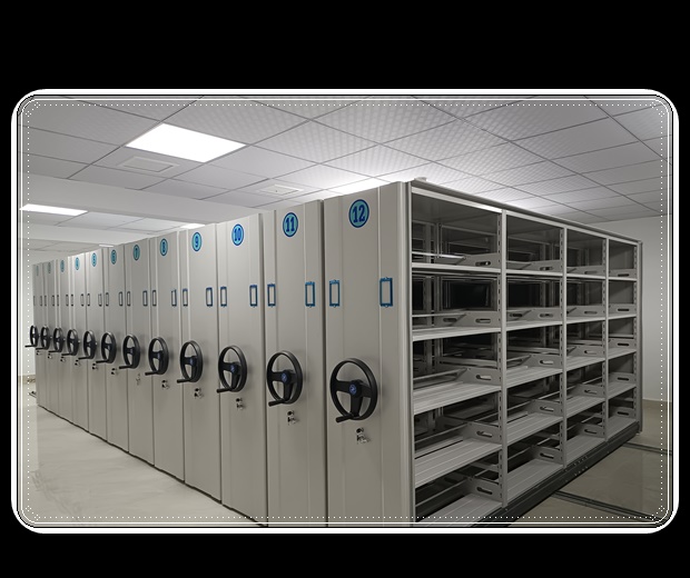 1、構造:移動密集柜、固定柜為框柜鋼結構。主要由20mm×20mm方鋼軌道、3.0mm底盤、1.5mm復柱立桿、1.0mm擱板、1.2mm側面板、1.0mm門板、旋動機構、防震裝置、防倒裝置、制動裝置以及防塵、防鼠裝置等部分組成。